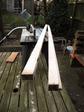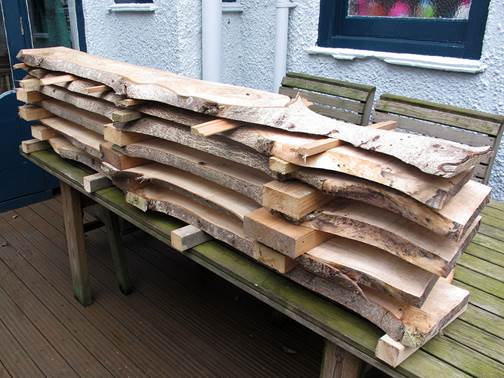 Being freshly cut from a live tree, it took another 2½ years of the planks being left in the bicycle shed in order to dry out sufficiently for further cuts and making into frame carcases.