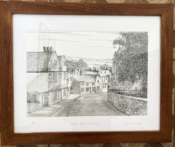 Although the intention was always to frame my own photographic images for clients, I have over the years framed the art and photos of other people on request. The above “Bailey Oak” example is a 4” (100mm) square watercolour from Jenny Shaw’s “Lest we forget” collection and below an A3 print by the artist Bill Westhead of Old Glossop. I’ve done a fair bit of framing for Bill’s work, but this particular one hangs in my living room.