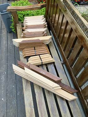 I procured the old oak worktop (left above) in order for Leigh and his team to cut it into battens for me. That, and another piece of battered mahogany from a broken desk were cut and brought home for various framing projects. The routed and mitred carcasses were laid out on the garden bench before being assembled into frames.