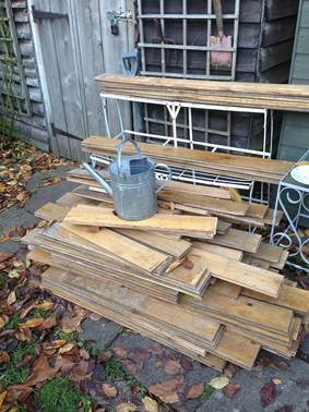 When friend and cooperative photographer Richard and his wife Fiona refurbished their kitchen, the former solid oak tongue-in-groove floor was saved from landfill and brought home for the next series of projects (the watering can is there for scale).